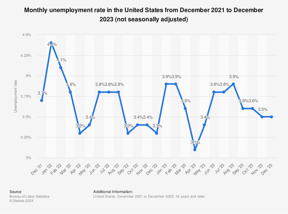 First, a look back: U.S. employers added 2.7 million new jobs in 2023, capping a three-year stretch that was the best since the 1990s. The unemployment rate stayed extremely low, as shown in the chart below.
